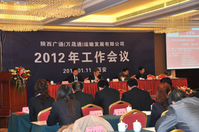 2012年1月11日,陜西廣通運(yùn)輸發(fā)展有限公司、陜西萬晟通實(shí)業(yè)有限公司2012年工作會(huì)議在西安悅豪酒店隆重召開。陜煤運(yùn)銷集團(tuán)公司總經(jīng)理助理、運(yùn)輸中心主任譚志軍,陜煤炭運(yùn)銷集團(tuán)公司財(cái)務(wù)部經(jīng)理、廣通公司財(cái)務(wù)總監(jiān)和學(xué)謙,廣通公司董事長、萬晟通公司董事長任曉鵬,廣通公司總經(jīng)理、萬晟通公司董事長助理沈來萬,萬晟通公司總經(jīng)理孟立新,陜煤炭運(yùn)銷集團(tuán)公司運(yùn)輸中心王江,以及廣通和萬晟通公司的員工代表共九十多人參加了此次會(huì)議。會(huì)議由廣通公司常務(wù)副總經(jīng)理張益銘主持。